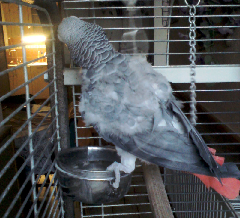 Ako vravím, je prekrásne operená, chvostové letky má krásne, nerozstrapkané, dlhé, jej veľkosť som už popisoval, je kľudná, vyrovnaná, neškrieka (len od radosti), "neklove", má nás všetkých rada (myslím mňa, manželku, a dvoch synov - ale ak si môže vybrať, tak najviac manželku...), je naučená špiniť len na jedno miesto, akurát... veľký "rečník" z nej pravdepodobne nebude, ale ... aj keby mala byť do smrti nemá, túto "vadu" jej v pohode "prepáčim".